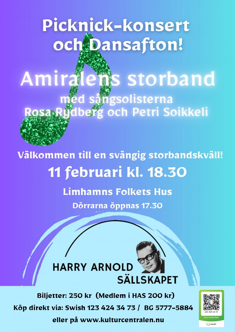 Lys upp vintermörkret med en kombinerad Picknick-konsert och Danskväll till Amiralens Storband med vokalisterna Rosa Rydberg och Petri Soikkeli, på Limhamns Folkets Hus. Grymt sväng utlovas!