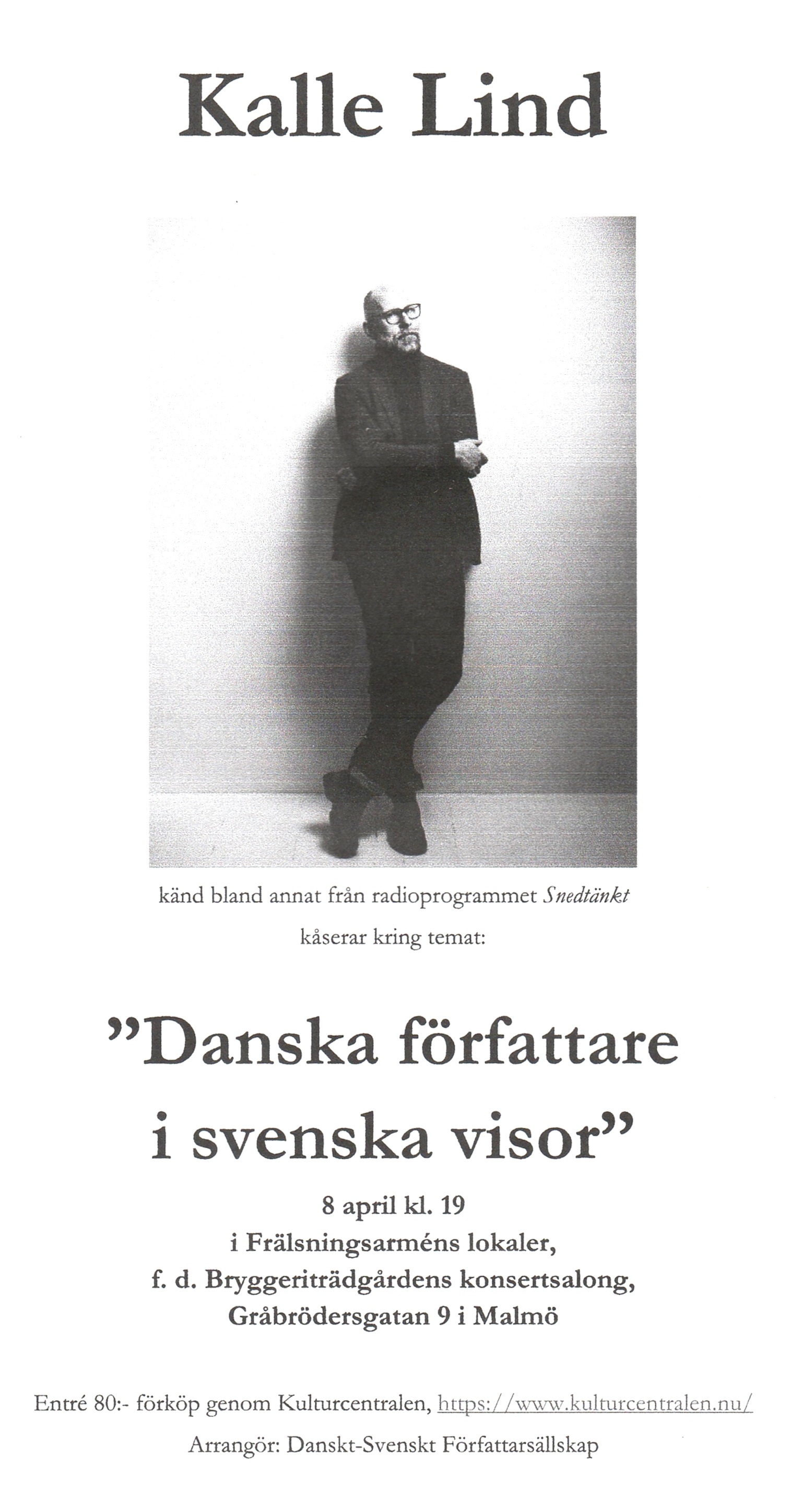 Kalle Lind - känd bland annat från radioprogrammet "Snedtänkt" - kåserar kring temat "Danska författare i svenska visor"